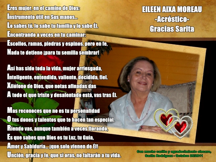 | Saludos, mi nombre es Eileen Moreu y estoy bien feliz que visites mi página. Espero que en ella puedas encontrar un rinconcito agradable donde pasar unas horas disfrutando de, música, poemas, reflexiones, videos y powerpoints de temas cristianos, a la familia, al amor y más... Conocerás un poco de mi y de mi familia y encontraras también la sección de mi bella Isla Puerto Rico. Espero que disfrutes de ella y no te vayas antes de firmar el libro de visitas, tus comentarios son muy importantes para mi. Gracias mil Eileen. |